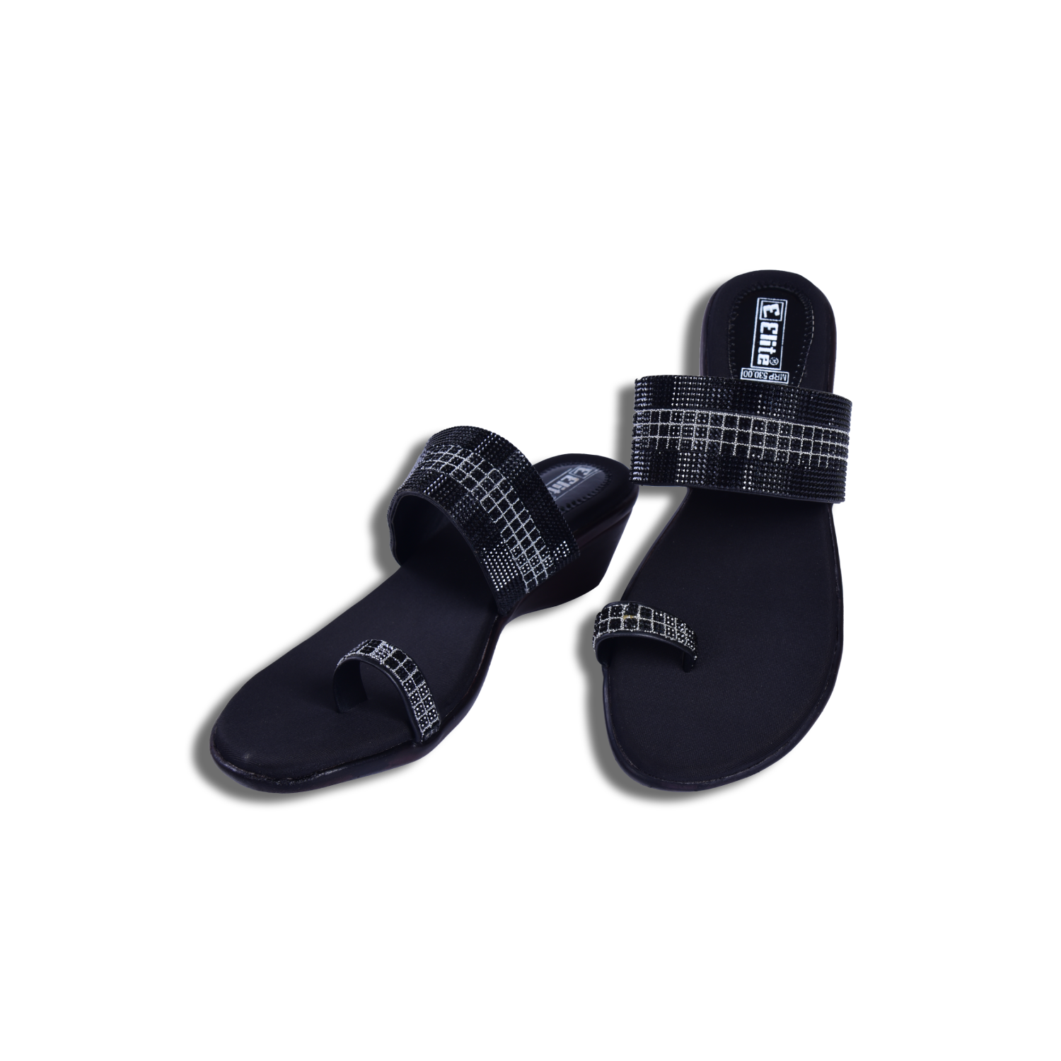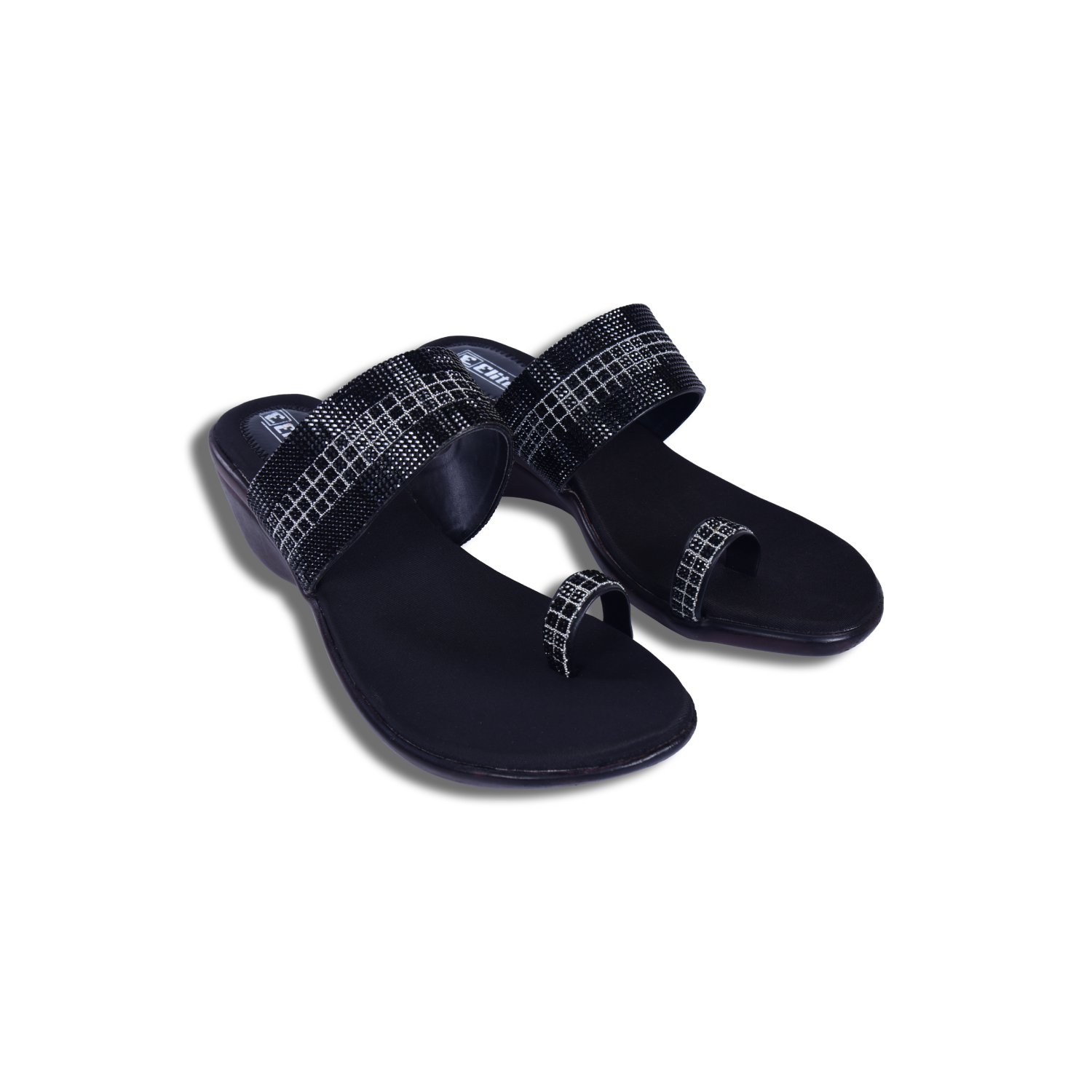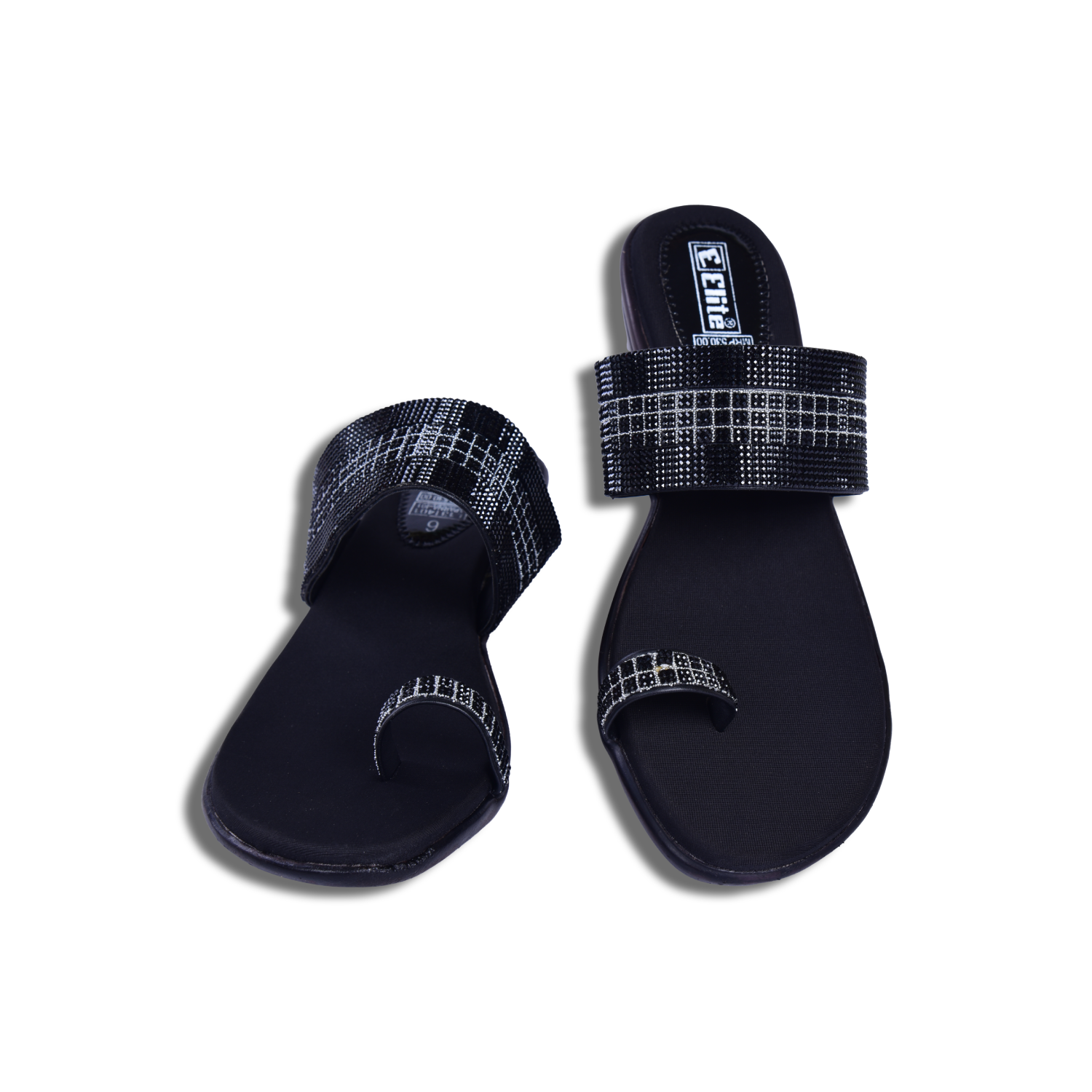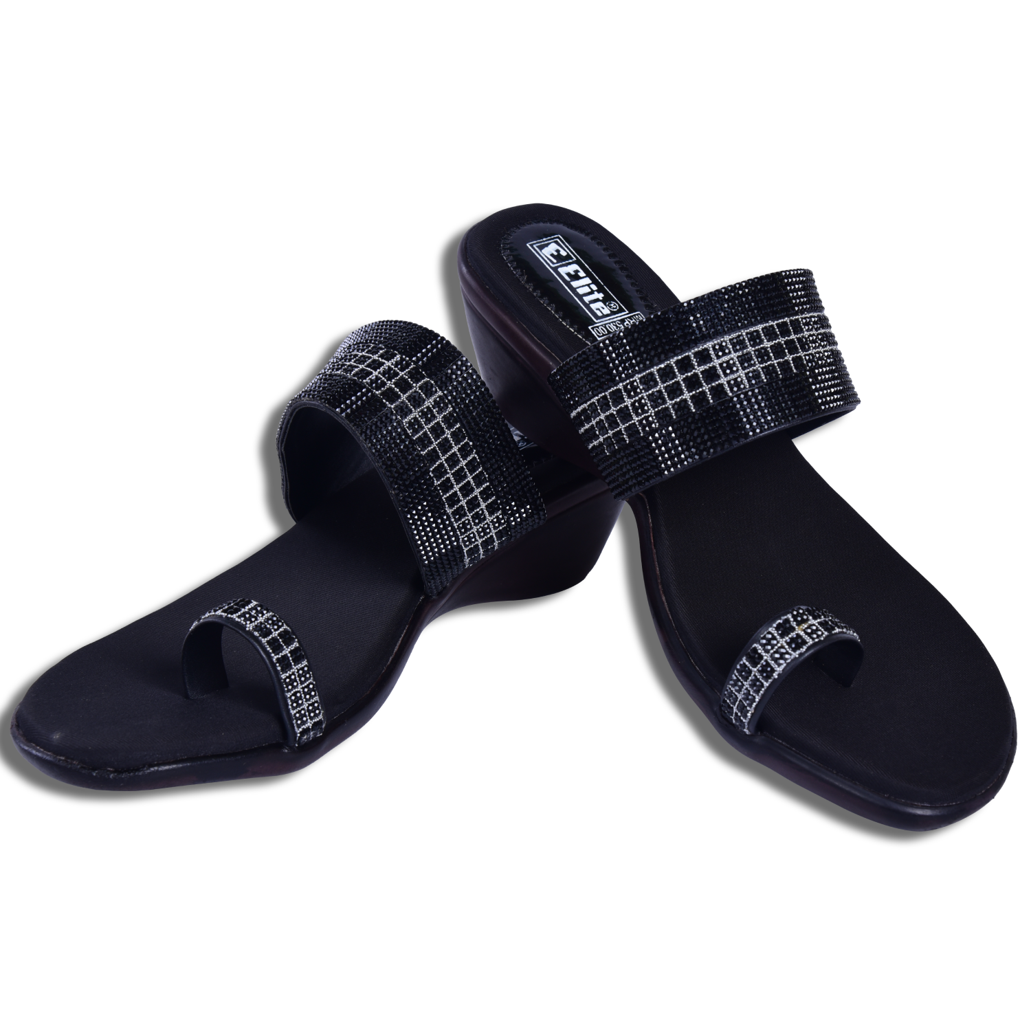 Featuring a black base with glitter-embellished geometric dual straps, these heels strike the perfect balance between elegance and statement styling. The slip-on construction ensures quick wear, while the dual-strap structure offers a secure, snug fit that stays in place as you move from cocktails to the dance floor.