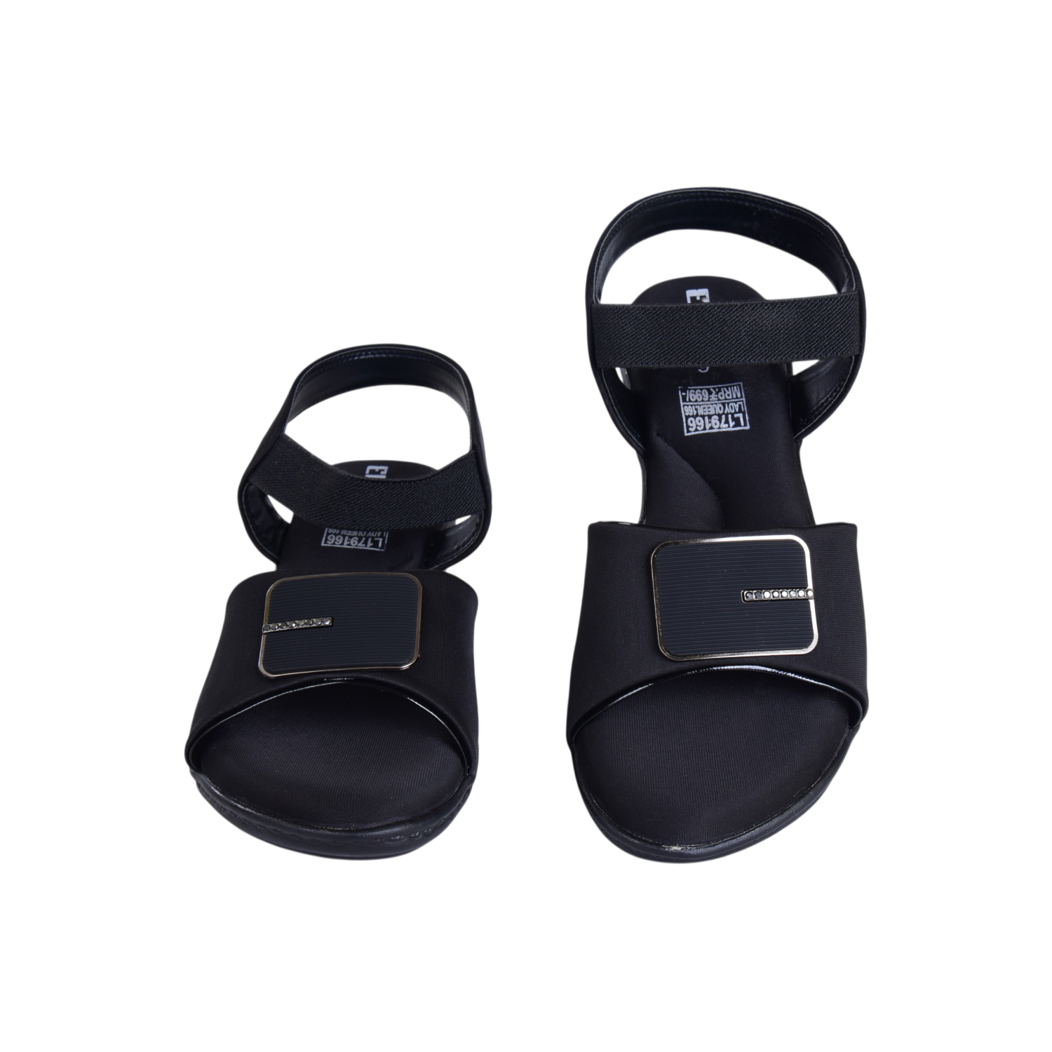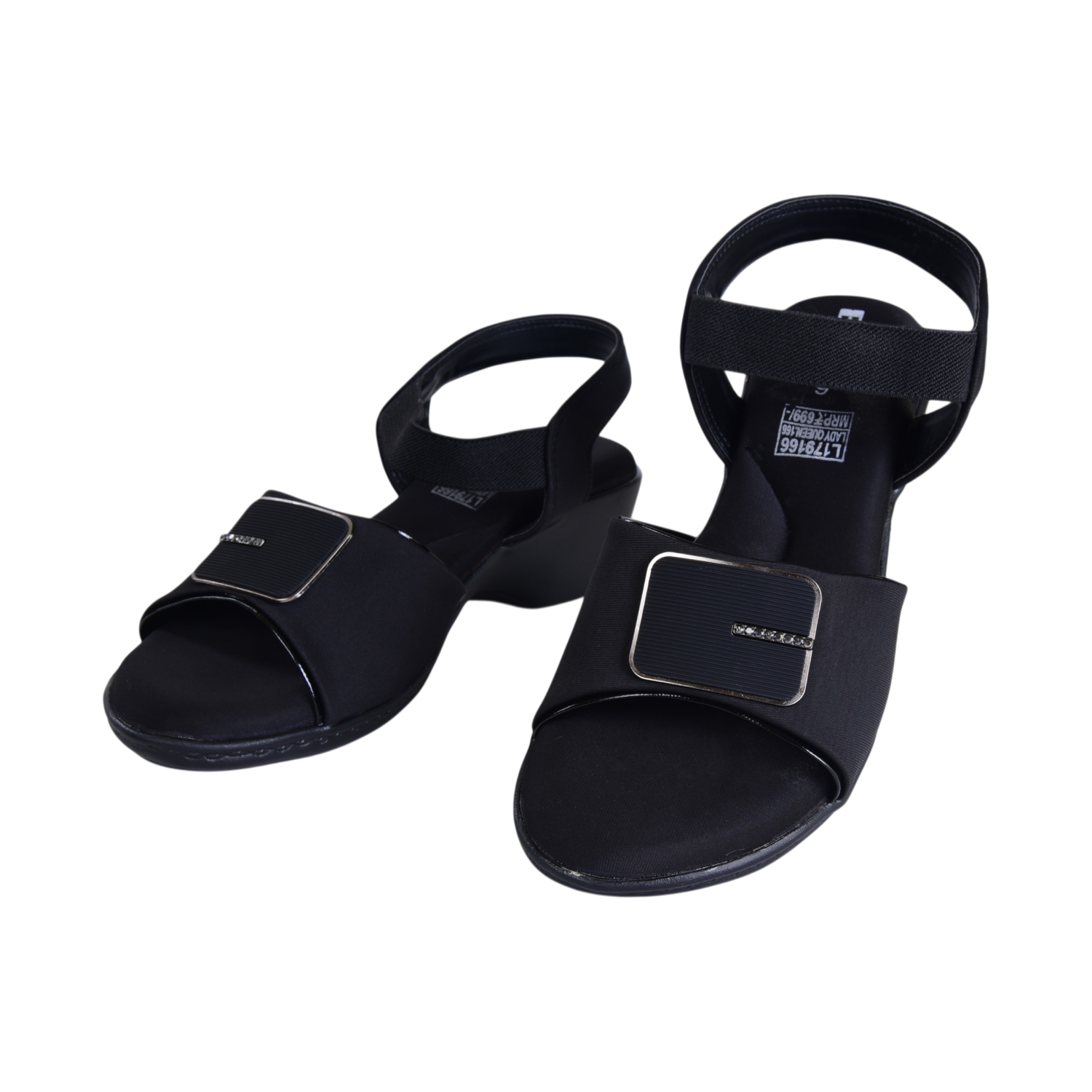Home Shop Women Elite Women’s Black Low‑Wedge Sandals – Stretch Straps, Branded Toe Detail, Everyday & Occasion Wear