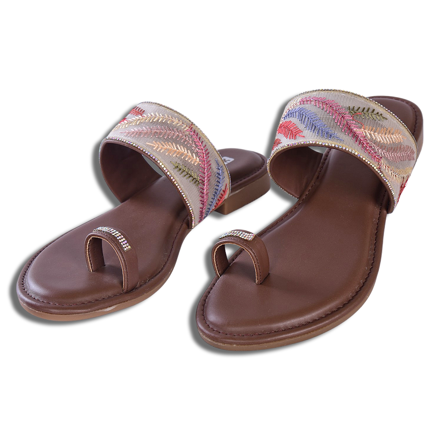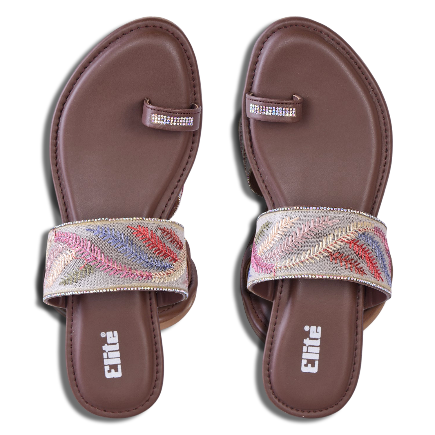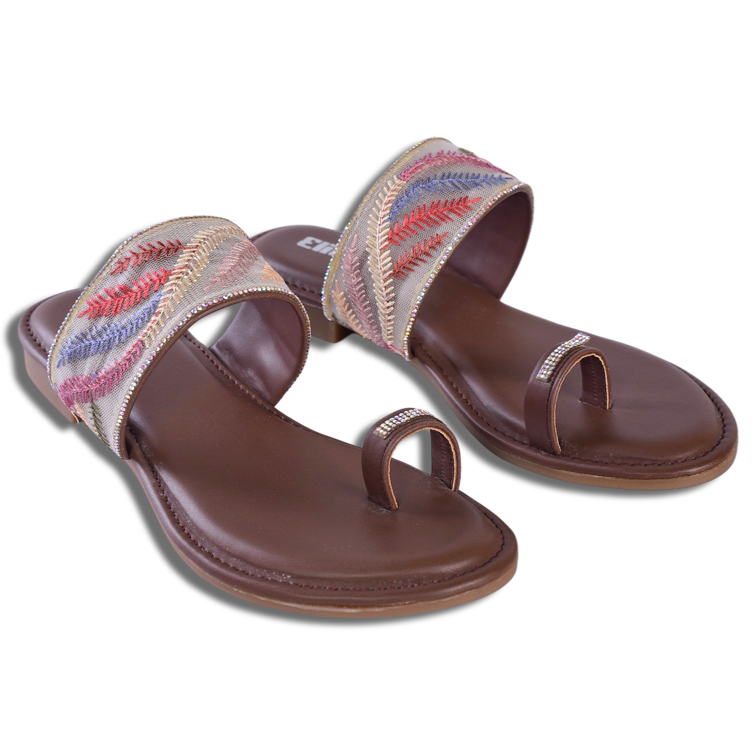The rich brown base creates a grounded, versatile tone that pairs beautifully with both ethnic and modern outfits. With a broad upper strap and toe loop for added stability, and a soft cushioned footbed for all-day comfort, these sandals make no compromise between aesthetic and ease.