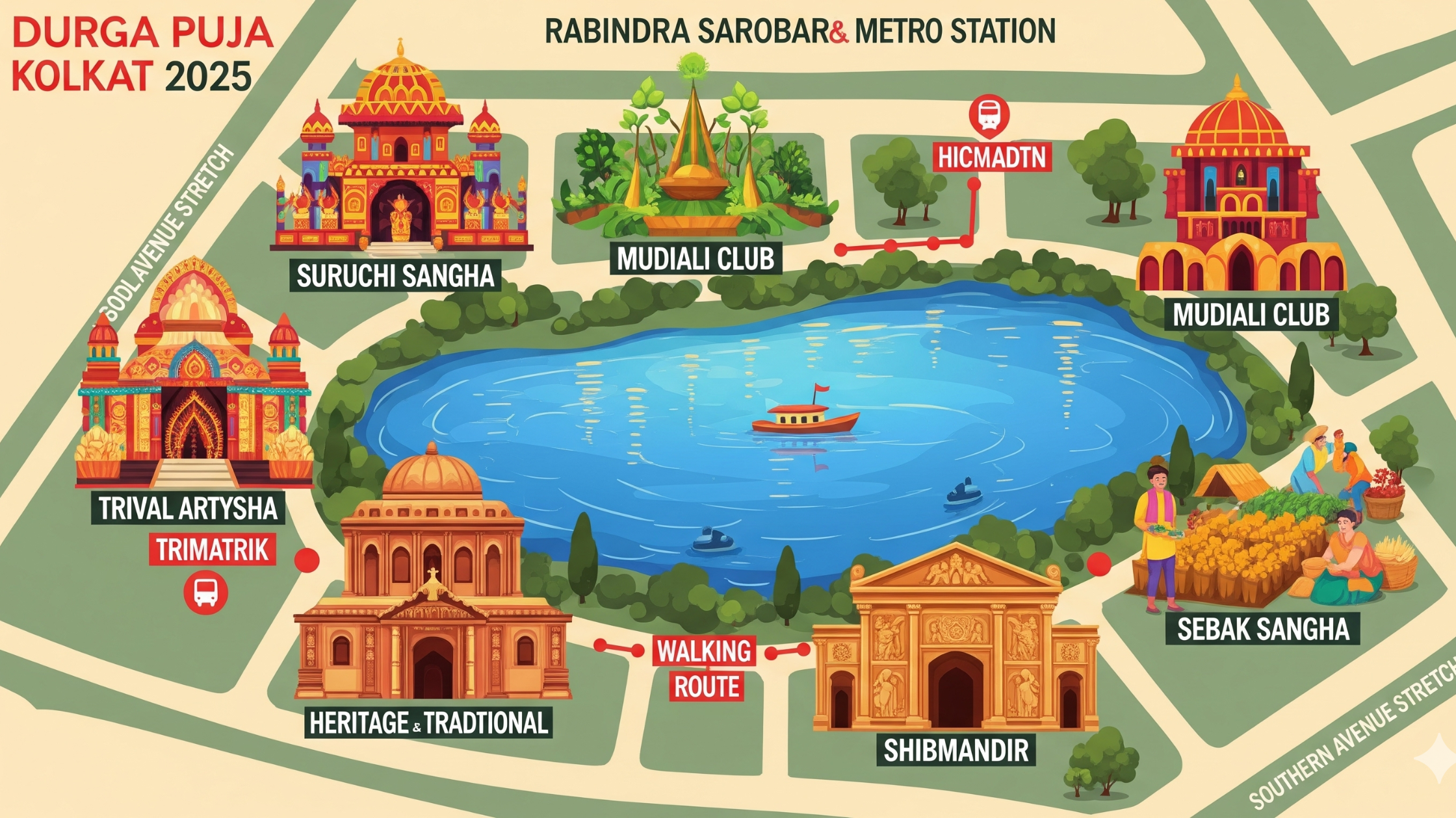 The Hazra to Kavi Subhas stretch covers some of South Kolkata’s most celebrated pandals, and with Elite Footwear’s guide, you’ll know exactly where to hop off and what not to miss.