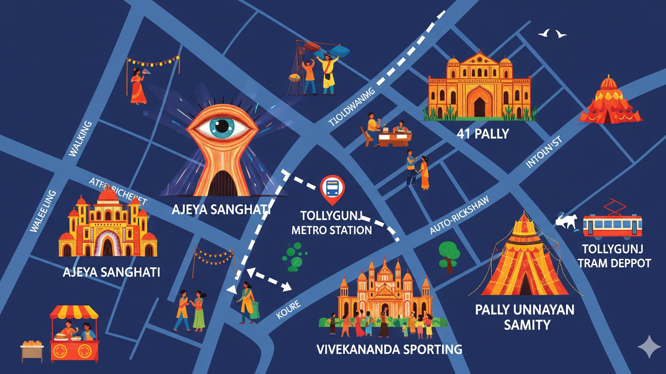 Exit towards Tollygunj Tram Depot → Start at Ajeya Sanghati → Walk to 41 Pally → Auto towards Vivekananda Sporting → Short ride to Pally Unnayan Samity.