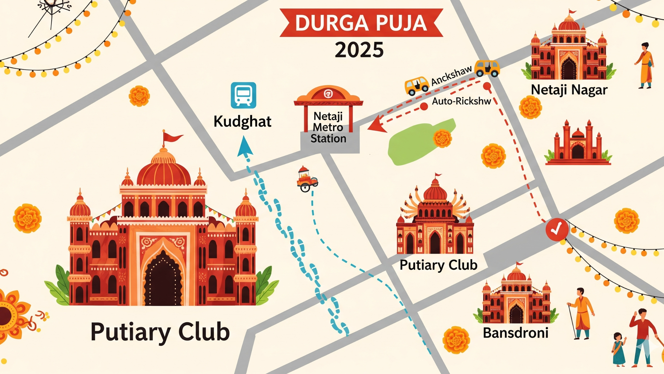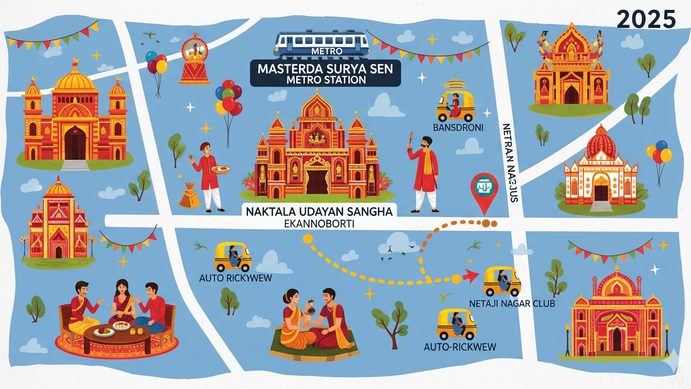 Exit towards Naktala → Visit Naktala Udayan Sangha (Main highlight) → Auto to Bansdroni clubs → Then ride to Netaji Nagar pujas.
