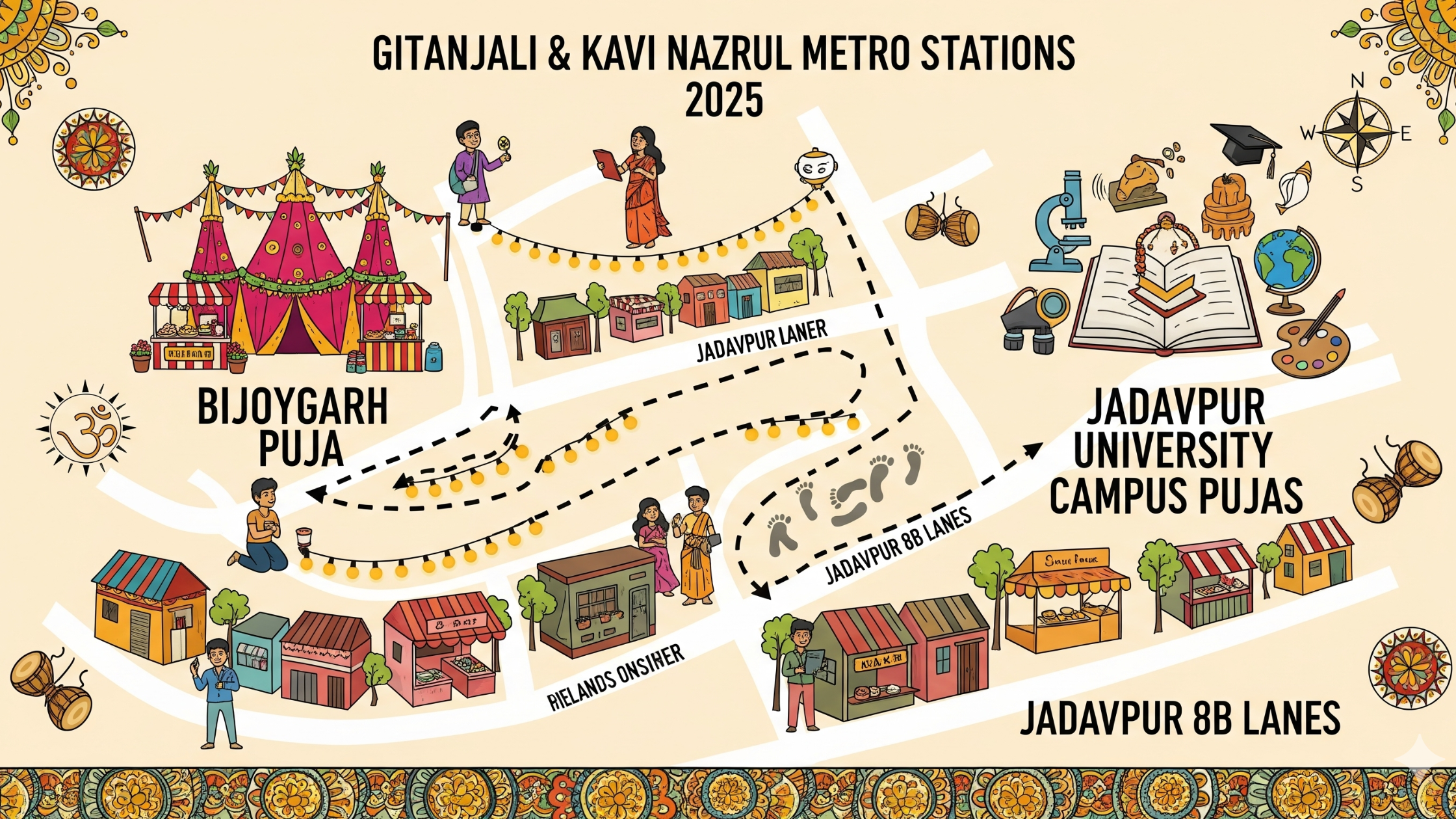Exit towards Bijoygarh → Walk to Bijoygarh Puja → Continue walking to Jadavpur University campus pandals.