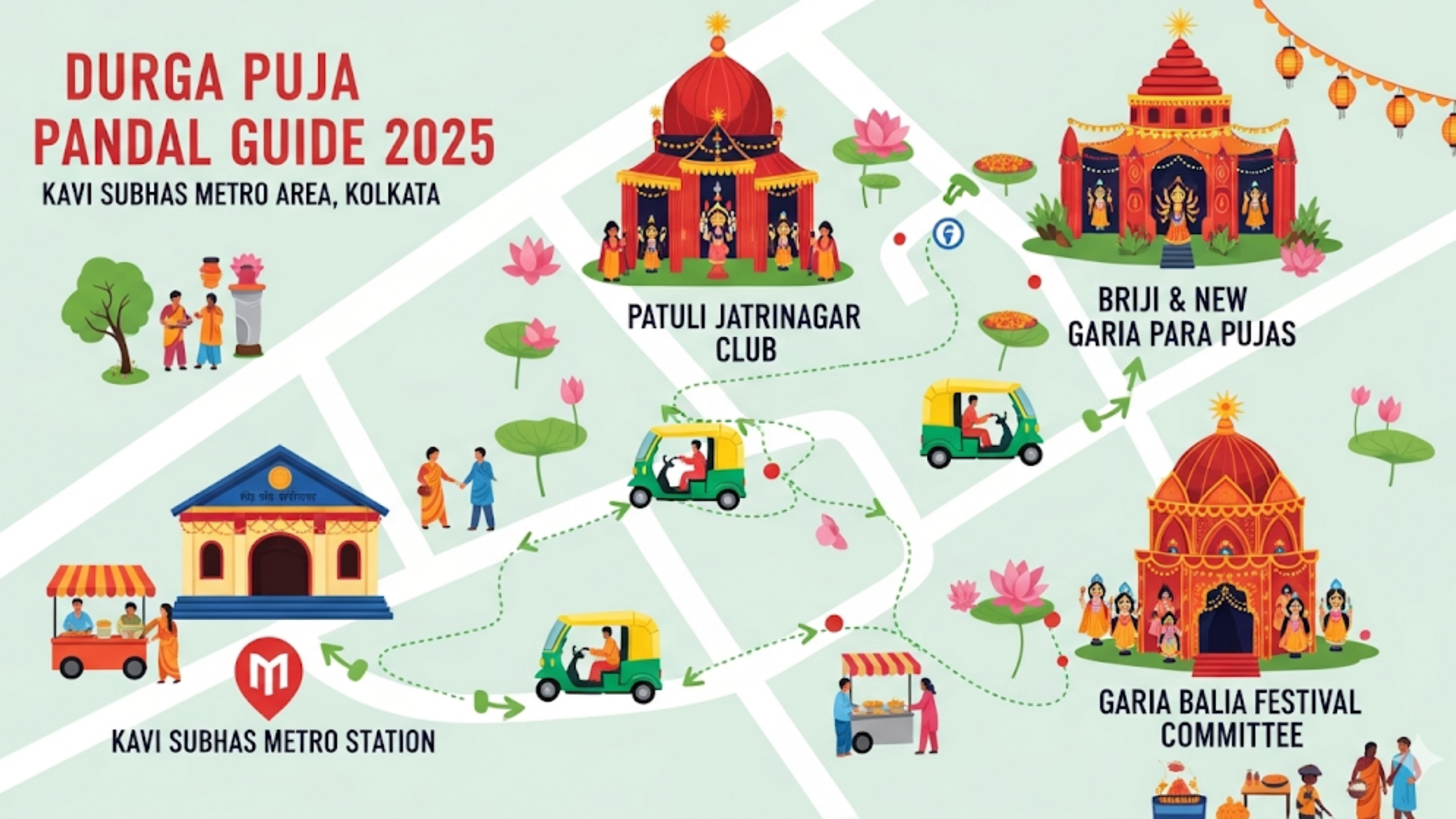 Exit towards Patuli → Visit Patuli Jatrinagar Club → Auto to Briji Para pujas → Continue to New Garia Para → End at Garia Balia Festival Committee.